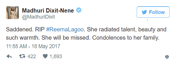 Veteran Actress Reema Lagoo died of a cardiac arrest in Mumbai a little after 3 am. She was 59. Ms Lagoo had been taken to the Kokilaben Hospital. Her last rites will be held later today. Reema Lagoo's son-in-law told news agency PTI, "She was complaining of chest pain so we took her to hospital around 1 am. She passed away due to a heart attack around 3.15 am. She was perfectly fine and had no health issues...so it is really shocking for all us that she is no more with us." Hospital authorities said they will issue a statement later after consulting Ms Lagoo's family. Reema Lagoo was a veteran of the Marathi stage and appeared in several high profile Bollywood films, working with top stars like Salman Khan and Akshay Kumar. Reema Lagoo is survived by her daughter Mrunmayee, also an actress. Messages of condolence have been tweeted by actors Amitabh Bachchan, Rishi Kapoor, Madhuri Dixit, Akshay Kumar and Priyanka Chopra.